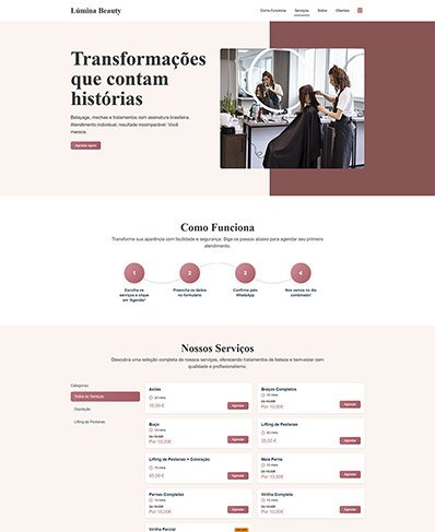 Design moderno, sistema de agendamento via WhatsApp e customização total. Ideal para os profissionais que buscam aumentar conversões e simplificar o processo de agendamento dos clientes.